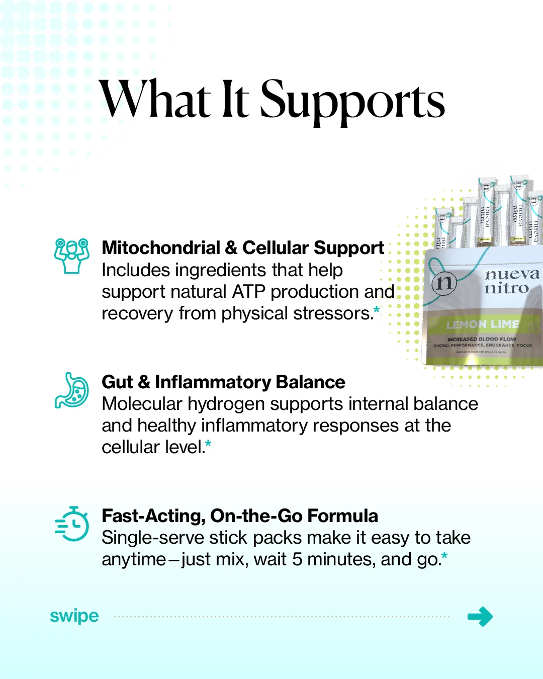 That’s where the real magic is. Nitro combines molecular hydrogen with L-citrulline — two powerhouse compounds proven by science to support circulation, clarity, energy, and recovery.