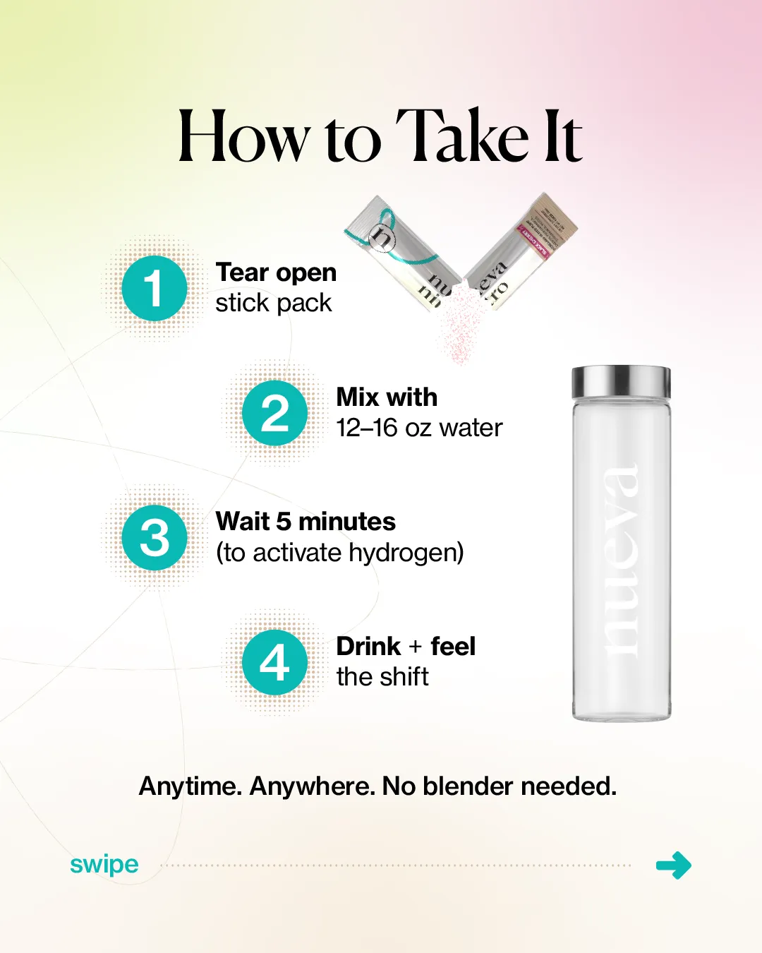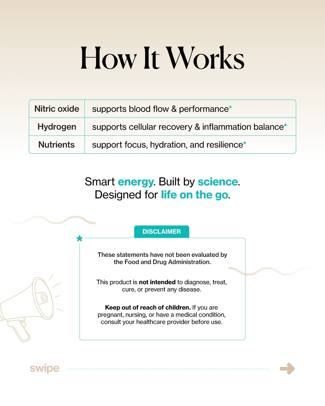 >If your energy fades early in the day, it gives you a steady lift by fueling your cells with molecular hydrogen — no caffeine needed.
