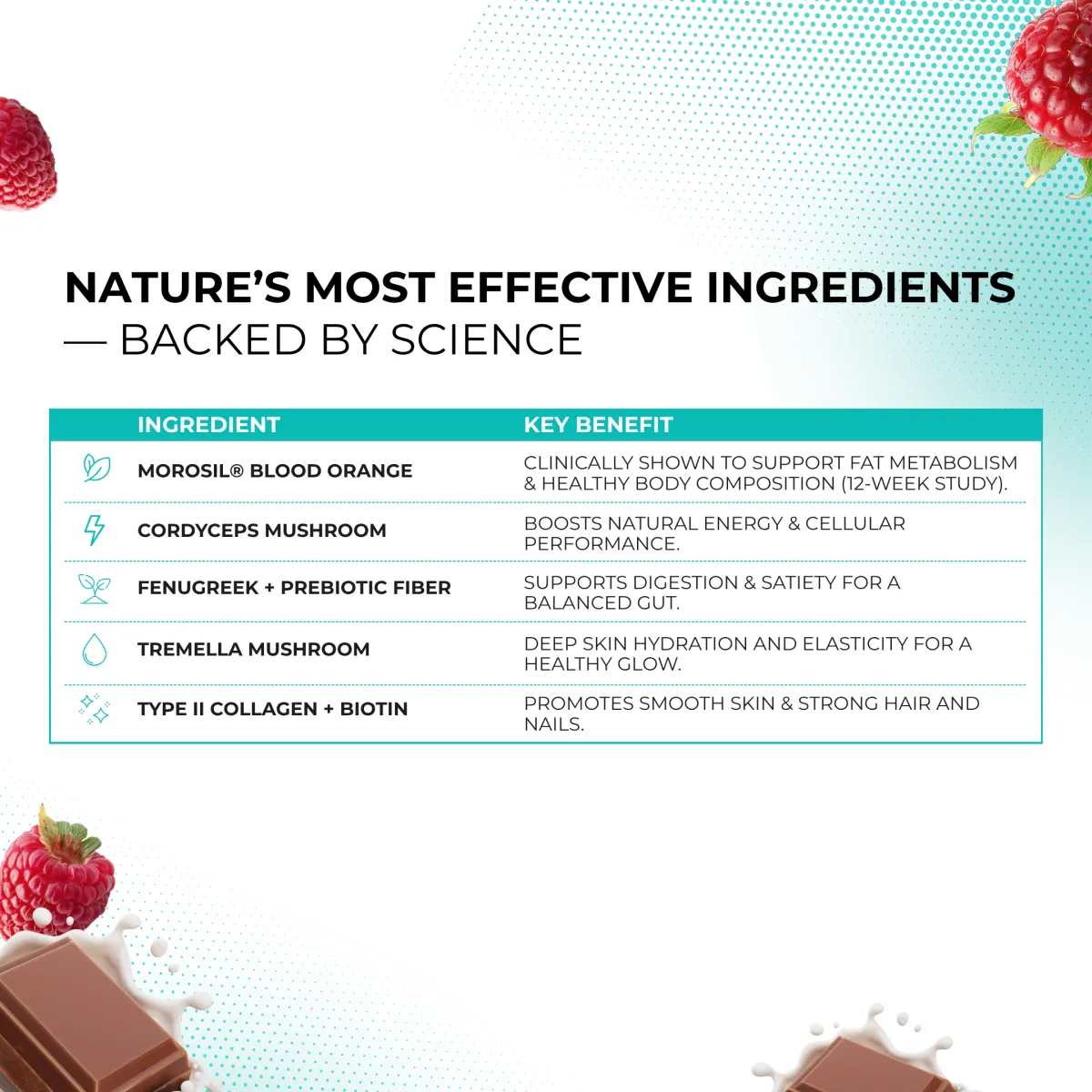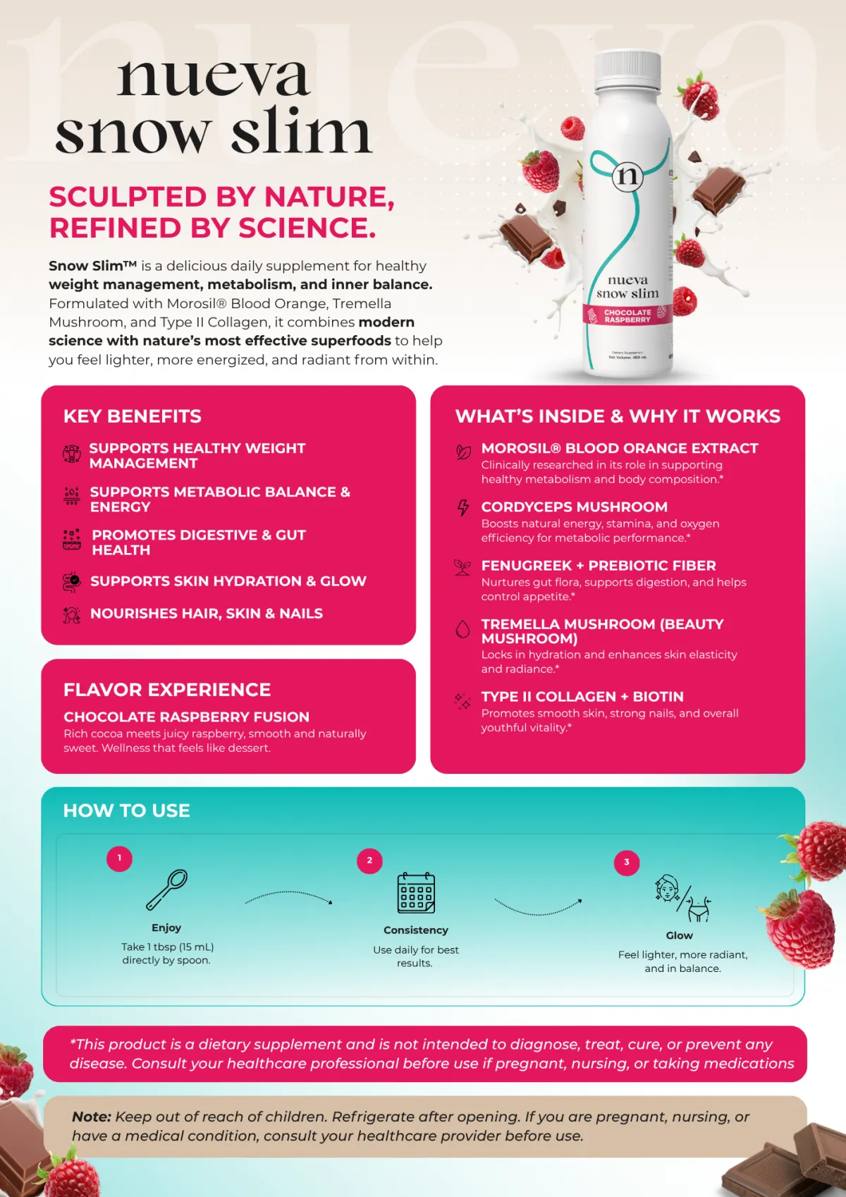 Snow Slim™ is a science‑backed daily supplement that blends Morosil® Blood Orange, Tremella (Snow) Mushroom, and Type II Collagen in a rich Chocolate Raspberry spoon. It’s crafted to support metabolic balance, healthy digestion, and that hydrated, confident glow from within.
